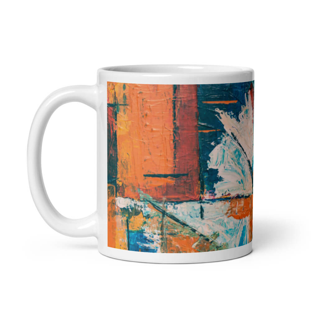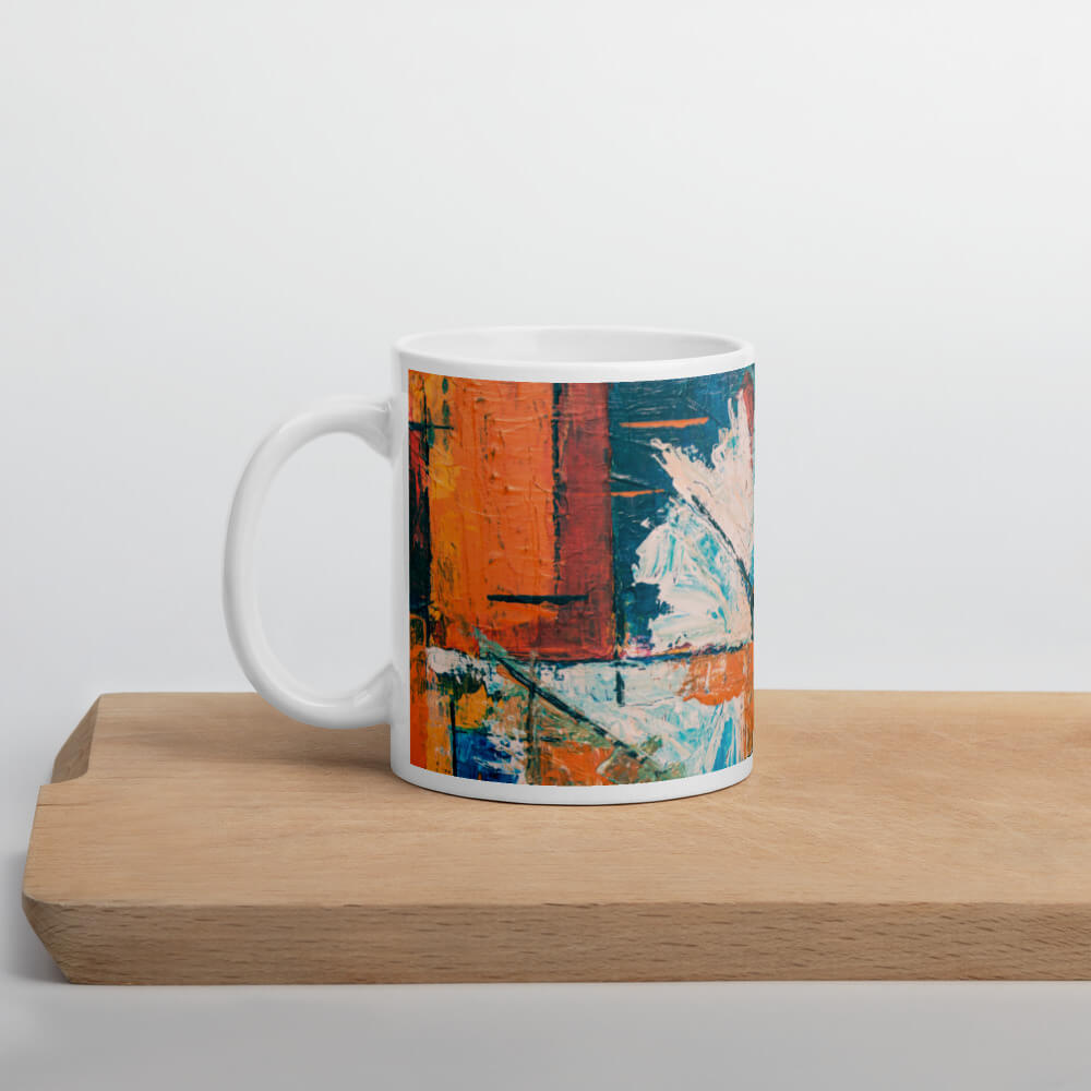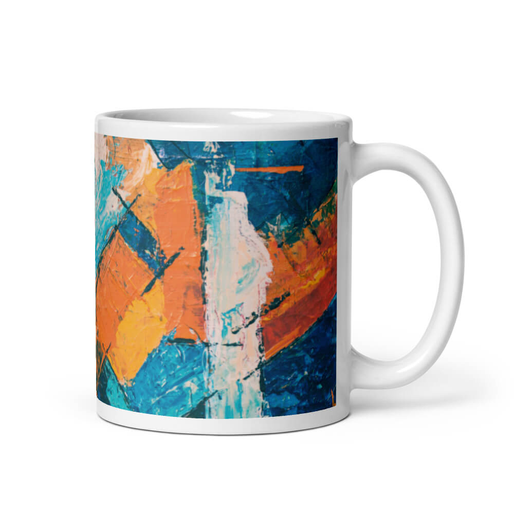 Mô tả sản phẩm Ly sứ hình vẽ tranh trừu tượng màu xanh, cam và trắng